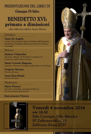 (26/10/16) Se celebrará el viernes 4 de noviembre a las 6,30 de la tarde en la Sala de Congresos Villa Mirador de Zafferana Etnea (Catania) la presentación del libro de Giuseppe Di Salvo “Benedetto XVI: primato e dimissioni” (Benedicto XVI: primacía y dimisión) (Aracne, 2016). El encuentro será presentado por Sante De Angelis y moderado por el padre Mario Pieracci. Junto al autor, participarán el padre Mathew Vellanickal, el padre Mario Corrado Magnano y los profesores Gregorio Monaco y Anna Rosa Micale.