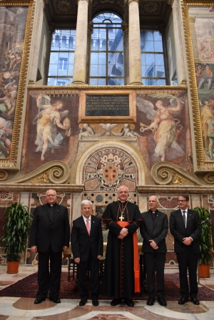 En la celebración del Premio Ratzinger, al final del Simposio Internacional “Deus caritas est. Porta di misericordia” organizado en el décimo aniversario de la publicación de la primera encíclica de Benedicto XVI, participaron los cardenales Bertone, Cordes, Grech, Koch, Monteiro de Castro y Sandri, los arzobispos Becciu y Farhat, Christian Schaller y Waldemar Chrostowski, que recibieron el premio en el 2013 y en el 2014, los miembros del Comité Científico, del Consejo de Administración y del Consejo de Revisores de la Fundación Vaticana Joseph Ratzinger - Benedicto XVI.